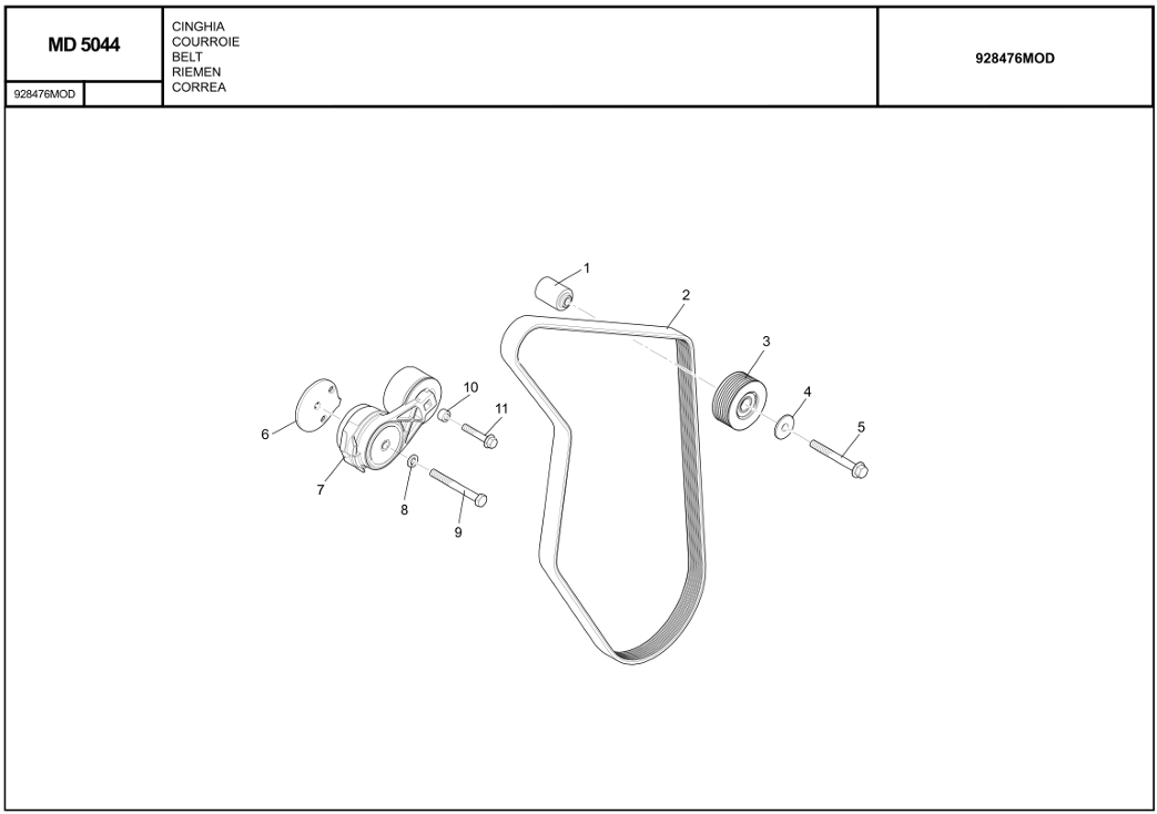 Item Part No. Name Remarks / Characteristi cs Qty Machine applicability 1 796005 Spacer 1 2 798258 Alternator belt 1 3 796008 Pulley 1 4 796003 Sleeve 1 5 796002 Screw H M10-85, M10 1 6 796449 Spacer 1 7 798950 Tensioner 1 8 796446 Washer 1 9 796447 Screw H M10-90, M10 1 10 796445 Spacer 1 11 796174 Screw H M8-60, M8 1