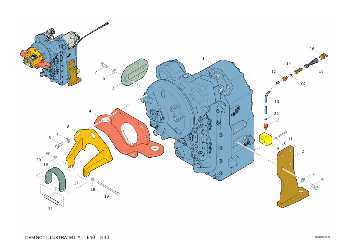 項目零件號名稱數(shù)量備注再制造件號L COMPLETE _ASSEMBLY-TRANSMISSION 1 ASSEMBLY DF150 E40-EL.TRANSMISSION 1 E40 - TRANSMISSION H40-HY.TRANSMISSION 1 HYDRAULIC TRANSMISSION 1 5580005914 TRANSMISSION 1 FUNKDF150 6060070314 2 5580008055 ATTACHMENT 1 BLACK 3 5580008058 ATTACHMENT 1 ELECTROPLATED FE/ZN 4 5580008061 ATTACHMENT 1 BLACK 5 5540112700 WASHER 14 WASHER-FLAT M16 HT PLTD 6 5540127900 SCREW, HEX HEAD 10 M 16 X 50 FULL - 10.9 FZY 7 5530879900 SCREW, HEX HEAD 4 M16X40 - 10.9 FLZNNC-480H 8 5580011375 SUPPORT 1 DRIVELINE PROTECTION 9 5580008065 BLOCK 1 PORT BLOCK 10 0301233500 PLAIN WASHER 2 8,4 / 16 X 1,6 -HB200 FZB 11 0147133303 SCREW, HEX HEAD 2 M 8 X 65 - 8.8 FZB 12 5541767500 FITTING 2 FITTING-COMPRESSION-PIPE 13 5580008066 DIPSTICK TUBE 1 OIL FILLING TUBE 14 5500510800 PIPE CONNECTION 1 CONNECTOR (PIPE/JIC)BULKH 15 5574842100 DIPSTICK TUBE 1 DIPSTICK TUBE WLDMT 16 5580008064 DIP STICK 1 DIPSTICK - TRANSMISSION 17 5580011382 PLATE 1 BLACK 18 0301235800 FLAT WASHER 4 13 / 24 X 2,5 - HB 200 FZB 19 0147142503 SCREW, HEX HEAD 2 M 12 X 200 - 8.8 FZV 20 0291112822 LOCK NUT 2 M 12 - 8 FZB / ISO 7040 21 5580012659 PIPE 2 BLACK 22 5541767400 SLEEVE 2 DELRIN SLEEVE-1/2